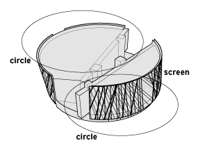 The basic form is a cylinder, with the top translated sideways. The cylinder’s overall diameter equals the width of the site, leaving triangular shaped open spaces in each corner. The symbolism of the circle and cylinder/drum is obvious. It is almost itself a symbol of good design. The circle is the most harmonious and cohesive shape; here it is manipulated to make it dynamic, reflecting the faster-paced, changing character of the times.