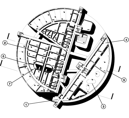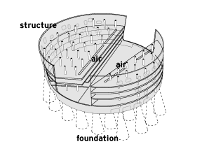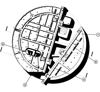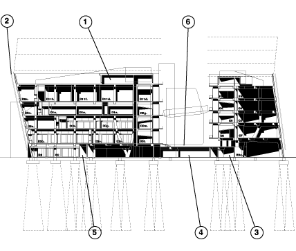 The structure has been zoned to support the logical and efficient layout of the other systems. Along the lightwell/courtyard inside the circular drum form, for example, runs a zone of smaller, service related spaces with more tightly spaced structural divisions and a slot for vertical conveyance of air conditioning and main plumbing shafts. The mechanical systems are divided between the ground floor and the roof, with the roof machines intended to be relocated during the future expansion to the new roof.