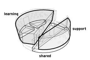 Above the ground level the building is divided into two major volumes by the central lightwell/courtyard; the larger volume houses all the learning areas—the classrooms, studios, laboratories and shops, while the smaller one accommodates the support areas—the administrative spaces, library, Learning Resource Center and student activity spaces. Within these volumes the more public programs like auditoria, meeting rooms and Design Enterprise program are concentrated on the lower floors, opening onto the central courtyard, and the more internally oriented program elements are found on the upper levels. Each major program division is organized on a single floor for convenience and identity. A service zone runs along the courtyard side of each volume, holding support-type activities and mechanical plenum for the distribution of services.
