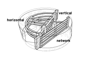 A nine meter square column grid and two way slab system meets a circular perimeter wall shell structure which, along with the stair and elevator core towers, provides lateral resistance. The structure is sized to carry the loads of the future building expansion. This additional cost factor is traded for the advantages of preserving the open area for positive community relations. The internal partitions are light cmu and light gauge metal framing for ease in modification, taking advantage of the flexibility of the column grid system. In keeping with the theme of honesty, flexibility and robustness, there are no embedded systems: all electrical, plumbing, voice/data and air conditioning systems run externally to the cast-in-place concrete. In this way the building itself can serve as a teaching laboratory and subject of endless experimentation.