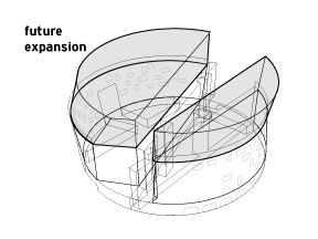 Vertical expansion is facilitated by the structure and materials of the first phase, with a structure just adequate to the future loads, a column grid that enhances flexibility for future moves and simplicity of load paths and transfers, and a durable exposed concrete finish that can withstand the stress of such transformation. Further, the vertical circulation cores are situated so that the future programmatic distribution could be vertical, rather than horizontal; each core could be the central node about which expanded program areas are organized. Three additional high bay floors can be accommodated within the 55m height restriction, permitting all of the required additional 25,000m2 to be added without taking up any of the ground level area.