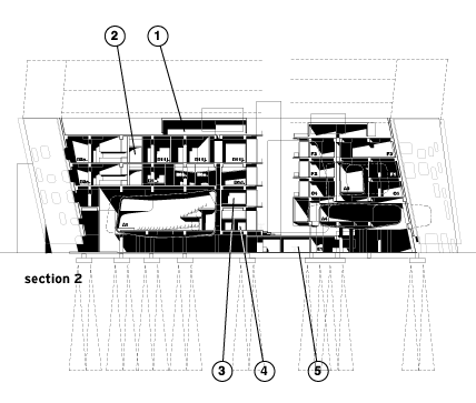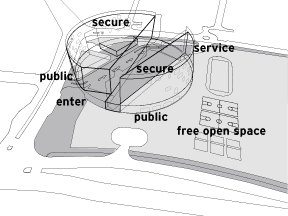 The major volumes above the podium are connected horizontally across the open space by a variety of outdoor bridges, and linked vertically to the podium and ground by strategically placed stair and elevator cores. A continuous service zone links the loading area to both major programmatic volumes at the ground level. The design uses a vertically layered security zoning to complement the conventional horizontal security divisions, allowing greater apparent freedom of movement. The students, faculty and staff meanwhile are able to circulate in secure corridors throughout the entire building vertically and horizontally without regard to interface with the public. At the ground level the public circulation flows freely around the building, or through it in a controlled way, while on the podium level the public is confined to the entry area and the auditoria immediately adjacent.