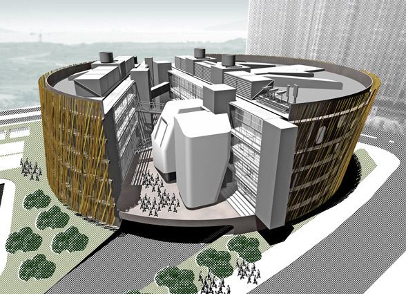Instead of producing a collection of little buildings, overshadowed by the surrounding tall residential towers, this scheme proposes a solitary building at the scale of the neighboring behemoths.