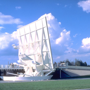 Located at the entrance of NASA's public visitor's complex at Kennedy Space Center, the Astronauts Memorial commemorates the pioneering lives of the fourteen American astronauts who have died in the line of duty. The Memorial consists of a 62 ft. high polished granite and welded steel wall that rotates and tilts to precisely track the sun through the course of each day. Attached to the back of the wall are pivoting mirrors that reflect the intensified sunlight through the letters of the astronauts' names—which are cut completely through the 3" thick stone monolith and filled with glass.